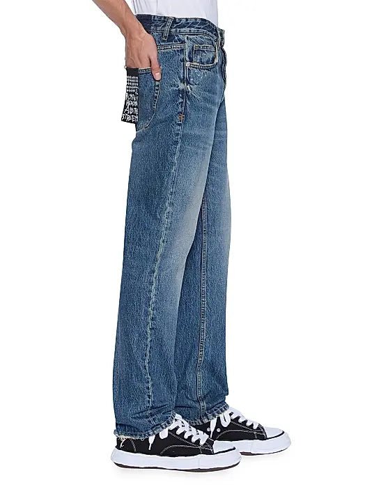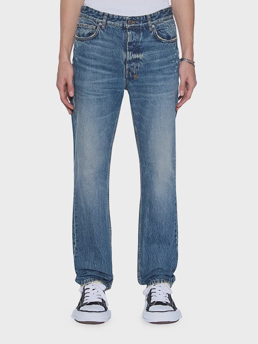The Hazlow Relik jeans from Ksubi are crafted of a rigid cotton denim. This pair is cut in a mid-rise, relaxed straight leg silhouette. This jean is made from a mid blue wash denim. Finihsed with Ksubi hardwear and 4x4 embroidery.
